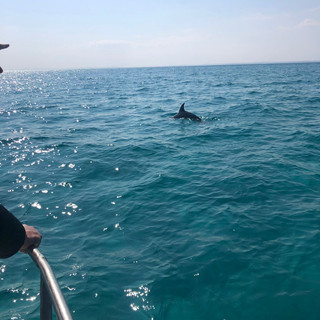 Pequeño delfín en la travesía . Yo con mi gorro africano